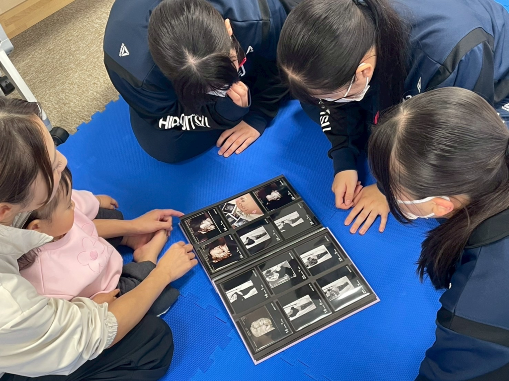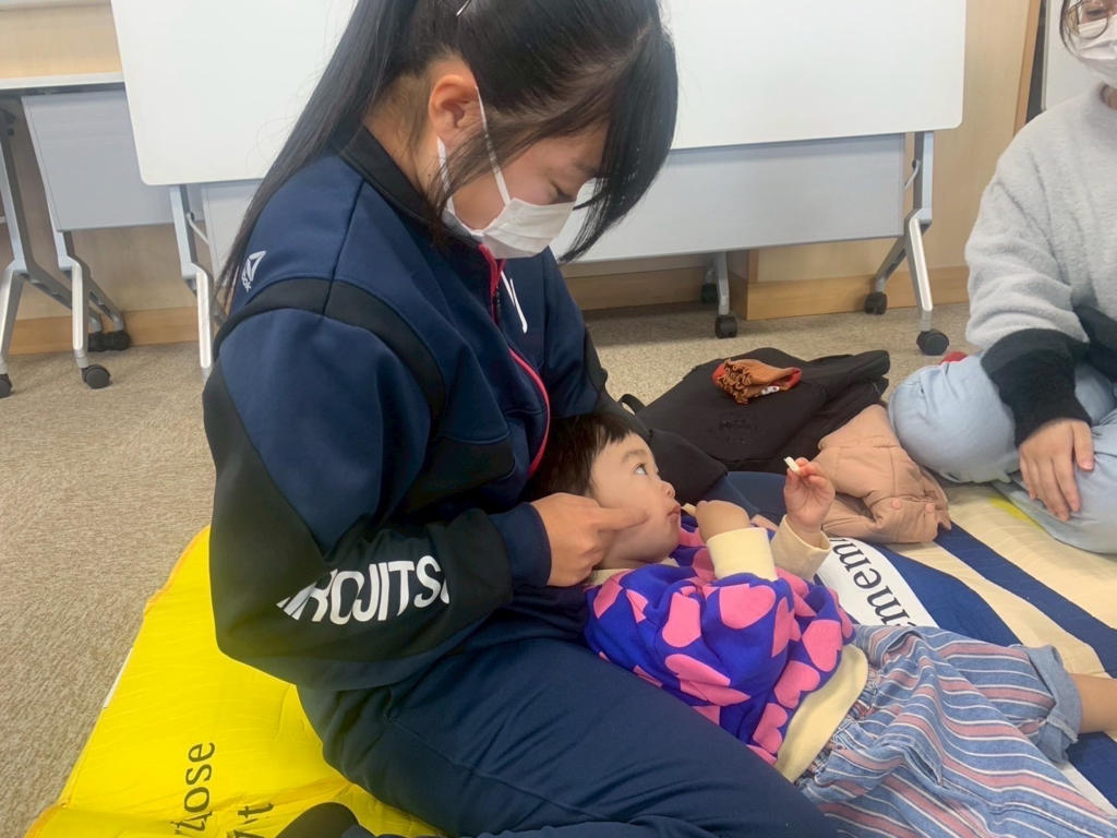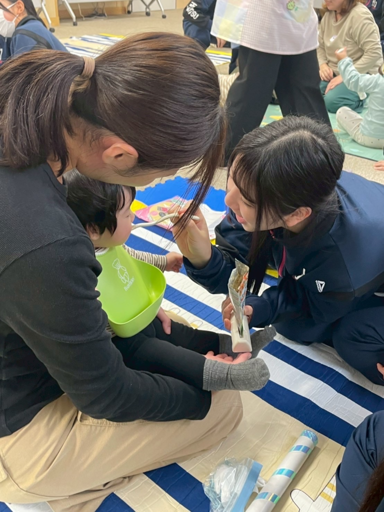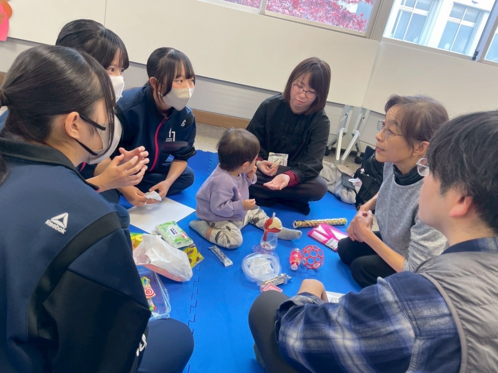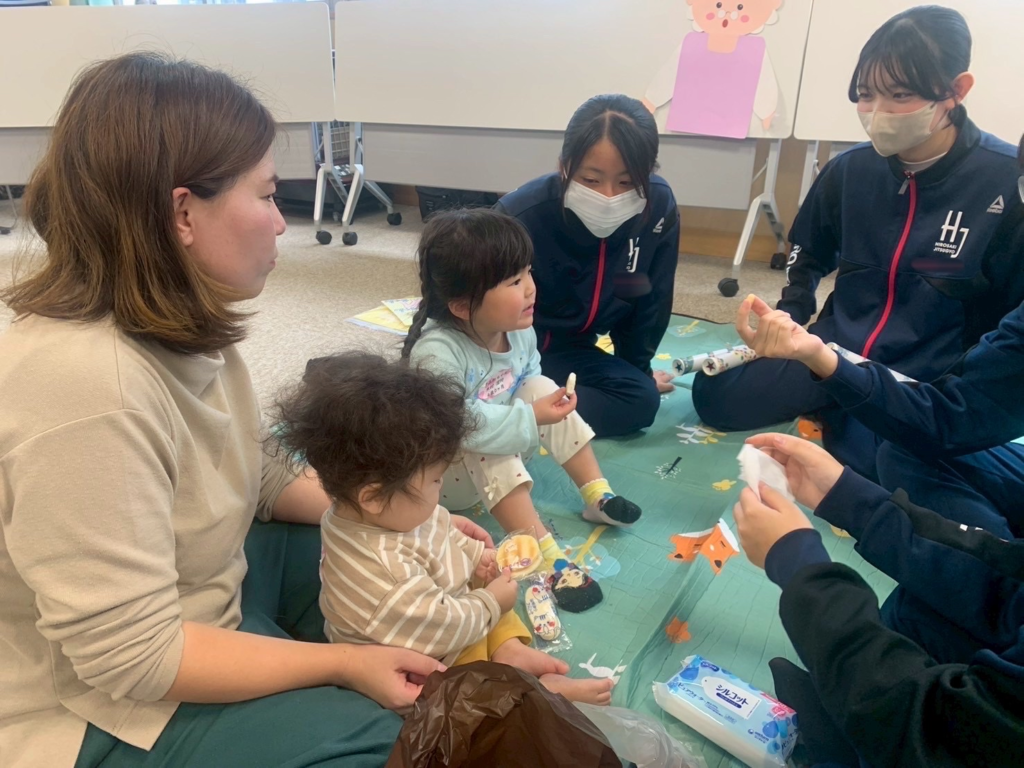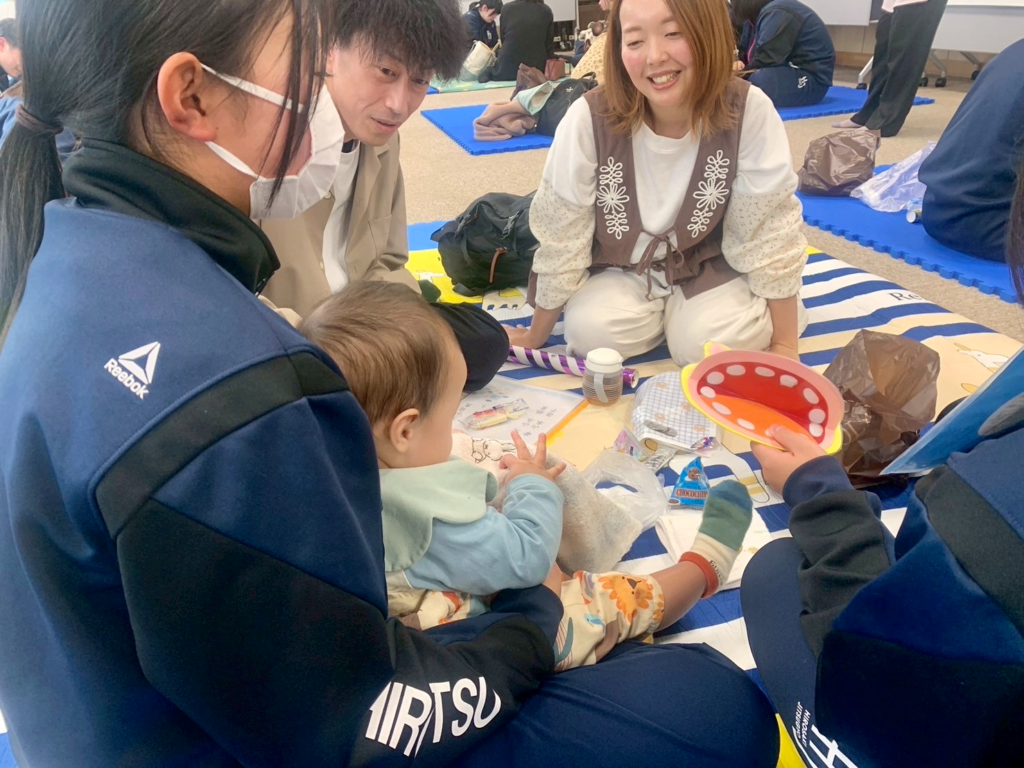 赤ちゃんと自作のおもちゃで遊んだり、思い出の品や写真を見せてもらったり、一緒に手遊びをしたり、お菓子をプレゼントしたり…