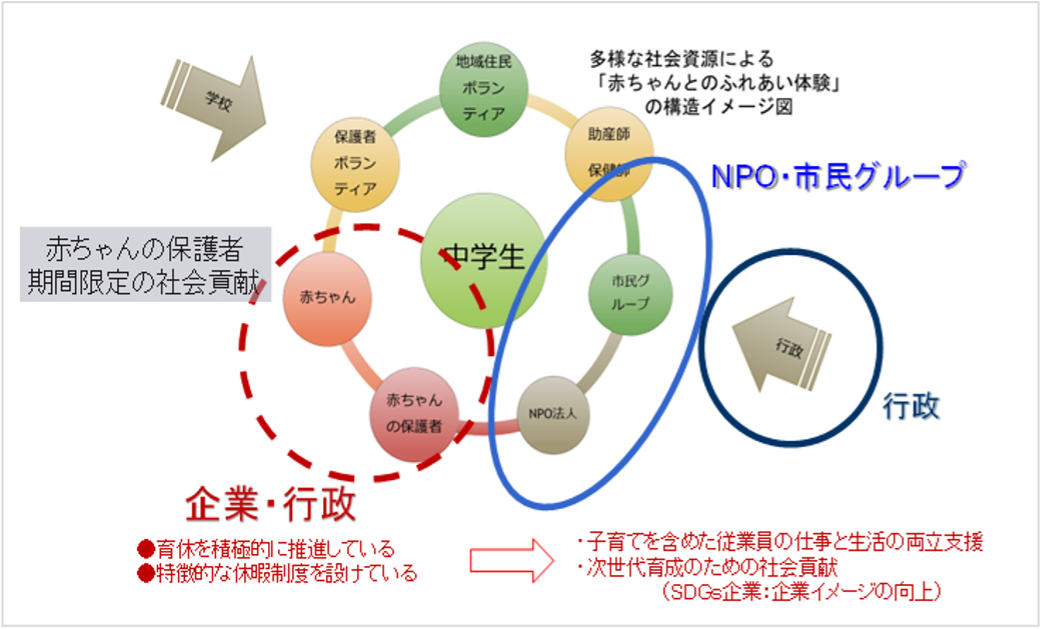 この縮図を成立させるためには、保護者、NPO・市民グループ、学校、行政などの要素と同様に「企業」の参画が不可欠です。